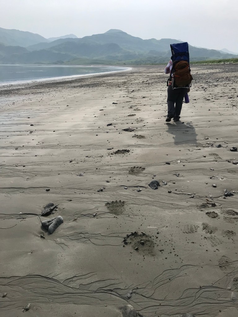 Erin Gamble carrying her son Wyatt down the beach at Tanginak, following bear footprints! (PC: Ben Fitzhugh)