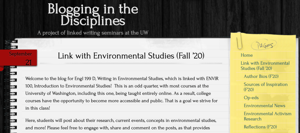 I was very happy with the two major assignments we worked on this term and was especially impressed by the quality of work that this group of first-year students was able to produce in this trying era. The first assignment was an op-ed about an ongoing environmental justice issue. The second was was a research paper on environmental activism, where students picked a topic around which there is a history of activism, analyzed how environmental justice was (or was not) incorporated into activism around that issue, and explored the stakes and stakeholders involved. Since students all chose different topics, they were able to teach each other (and me!) about a wide range of issues such as oil drilling in the Arctic National Wildlife Refuge, the Clayoquot Sound protests, gentrification of the International District in Seattle, racial injustice in New Orleans in the context of Hurricane Katrina, the longstanding consequences of uranium mining in the US Southwest, and the conservation of mountain gorillas in Rwanda (non exhaustive list). The students complemented these formal writing assignments with public-facing blog posts about their research and news items.